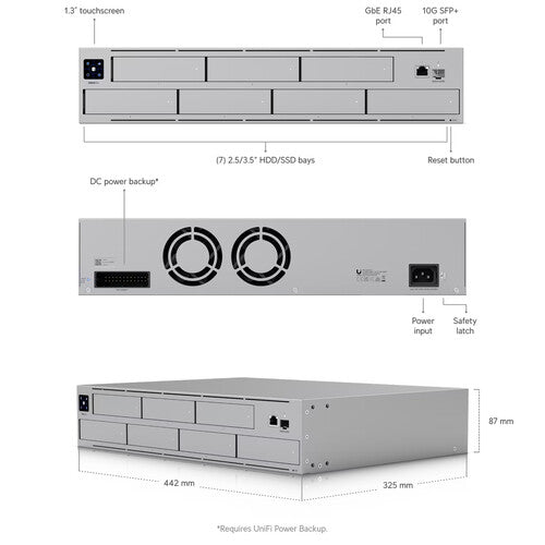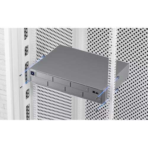 The rack-mountable 2U chassis is built from durable SGCC steel, supports UniFi power backup, and integrates seamlessly with UniFi Drive for centralized management.