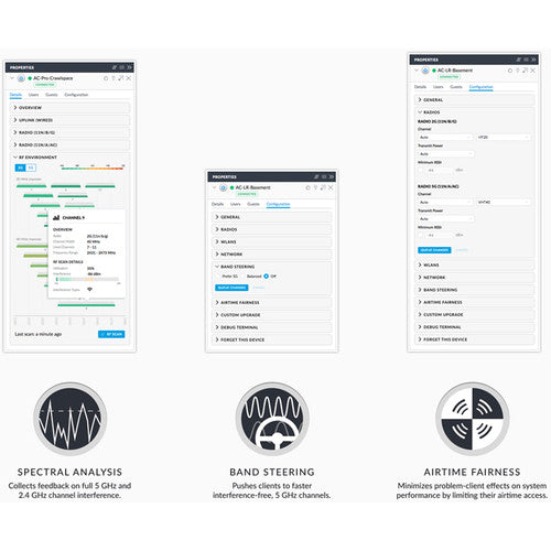 | Features | Wireless meshing, band steering, fast roaming (802.11r), captive portals, VLAN, hotspot 2.0, PPSK, WiFi scheduling |