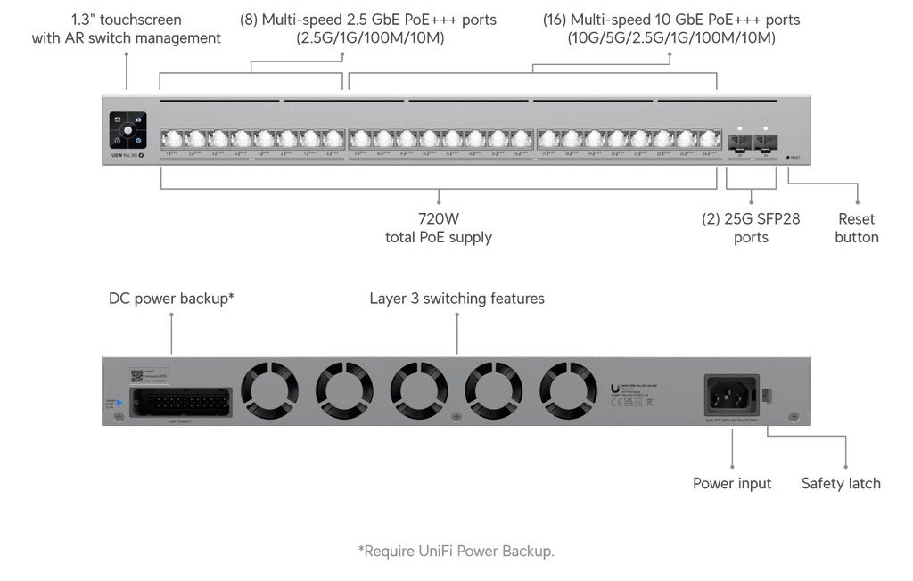 Port Layout 8 × 2.5G RJ45 (PoE+++), 16 × 10G RJ45 (PoE+++), 2 × 25G SFP28